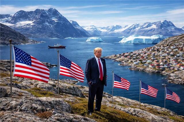 Trump in Greenland with U.S. flags and icebergs in background
